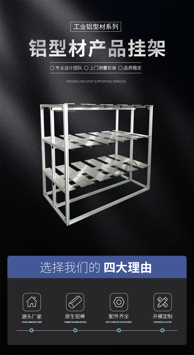 鋁合金懸臂掛線架由專用工業(yè)鋁型材根據(jù)客戶需求進(jìn)行免費(fèi)設(shè)計(jì)、切割加工,由配件連接而