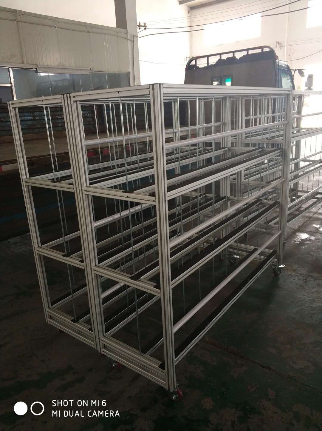 工業(yè)鋁型材做成的框架成品中,有幾種產(chǎn)品很是小巧可愛還實(shí)用,幾乎在每個(gè)車間或者工廠都或多或少能看見它們的身影。它們就是用鋁合金型材組裝定制的各種鋁型材周轉(zhuǎn)小車。