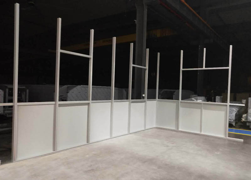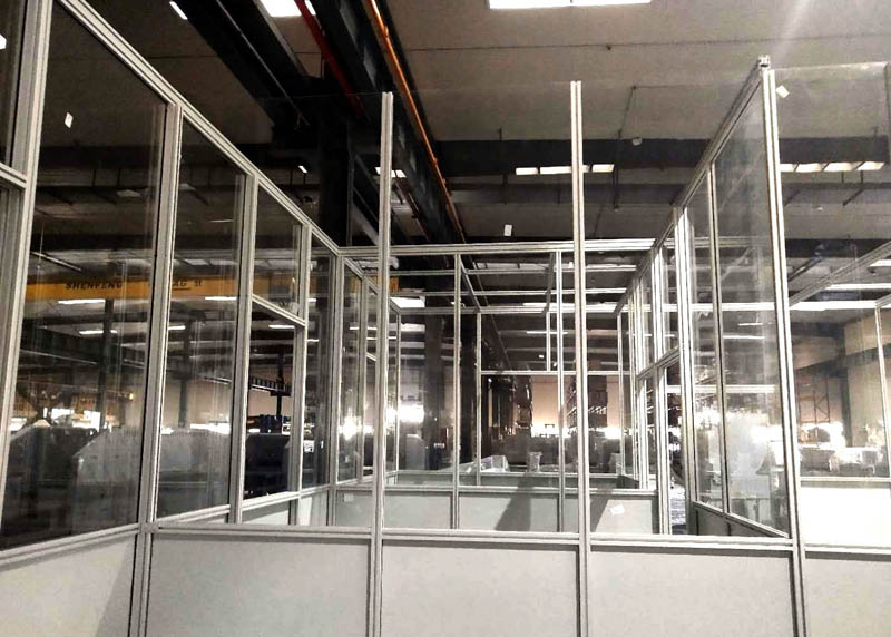 車間隔斷一般是用在工廠車間或者是辦公室的一種用工業(yè)鋁合金型材定做安裝的能代替墻體墻面的一種設(shè)施。將鋁合金型材用專門的連接件連接組裝好即可,非常的牢固,并且鋁合金表面經(jīng)過陽極氧化防腐耐磨性能好。用鋁合金型材定做的車間隔斷是目前廣大廠區(qū)、車間等辦公地用的相對較多的材料。其優(yōu)勢在于防腐耐磨防潮防火,并且無需焊接拆裝方便,材料可回收再利用。
