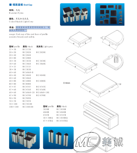 鋁型材端蓋按顏色分為黑色和淺灰色,黑色型號(hào)有1530、2020、2040、2080、3030、3060、3535、3838、6060-8、4040、4060、4080、8080、4545、4560、6060-10、4590、9090、5050、50100、100100、3030R、4040R,淺灰色有2020C、3030C、3060C、4040C、4080C、4545C、4560C、6060-10C、4590C,鋁型材端蓋是安裝在型材端面上的,即美觀又保證安全,還可以防止其他物質(zhì)掉落到型材里。