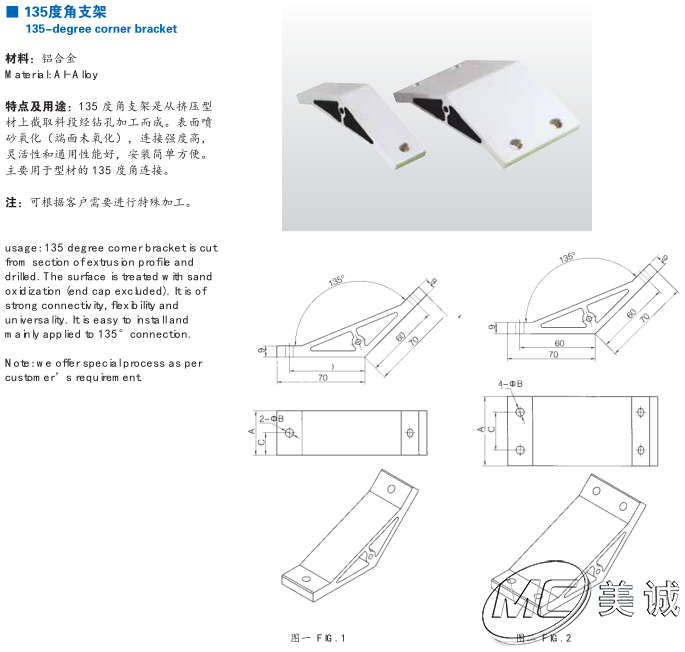 特點(diǎn)及用途:135度角支架是從擠壓型材上截取料段經(jīng)鉆孔加工而成。表面噴砂氧化(端面未氧化),連接強(qiáng)度高,靈活性和通用性能好,安裝簡(jiǎn)單方便。主要用于型材的 135 度角連接。